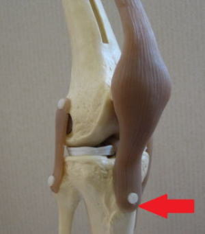 膝を伸ばす筋肉である大腿四頭筋(太ももの筋肉)は膝蓋骨(お皿)と膝蓋靭帯(お皿の下の筋)を介して脛骨粗面に付着しています